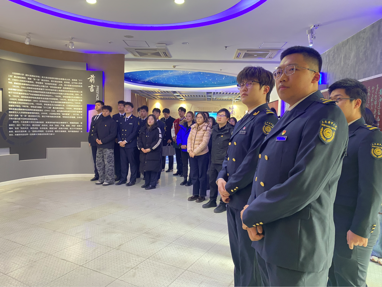 随后,全体党员一同参观了大连海事大学航海教育博物馆和新图书馆。在博物馆内,大家通过丰富的展品深入了解了中国航海事业的辉煌历程与“海洋强国”战略的实践。在新图书馆,党员们切身感受了现代化学习氛围与浓厚校园文化的融合。此次实地参观加深了全体党员对航海文化的认识,同时切实增强了同学们服务国家战略的责任感与使命感。