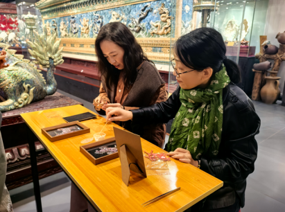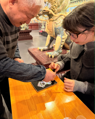 随后,中国工艺美术大师、省级非遗传承人金阿山亲临现场,指导党员们进行生肖贝雕制作体验。考虑到贝雕工艺的专业性与复杂性,前期雕刻工作已由馆内工艺师完成,党员们在金阿山大师的示范与指导下,专注完成后续的打磨、拼贴等环节。“亲手触摸这些光滑的贝壳,一点一点拼合成型,让我真正体会到什么叫‘匠心’和‘专注’。”一位参与体验的学生党员如是说。通过亲手实践,大家对非遗传承人精益求精的工匠精神有了更真切的认识。