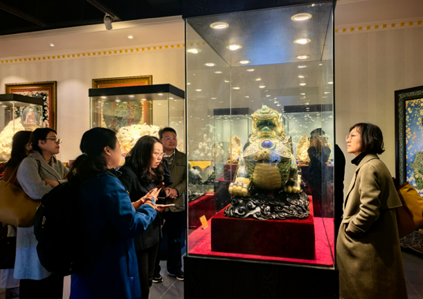 大连金阿山艺术馆是省级非物质文化遗产“大连贝雕”的核心传承展示基地,馆内汇集了大量贝雕艺术精品,系统展示了大连贝雕的传承历史、精湛技艺与文化内涵。在馆内,省级非遗传承人金吉带领全体党员参观展厅,并对《九龙壁》《龙凤呈祥》《麒麟》等镇馆之宝进行了生动讲解,从创作背景、文化寓意到工艺细节,娓娓道来,令师生党员深刻感受到非遗艺术背后深厚的文化积淀。